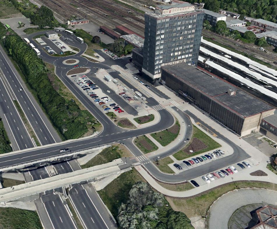 Došlo k propojení přednádražního prostoru s tramvajovým přestupním uzlem, bohužel již ne s možností „přestřešeného“ pěšího propojení. Po odevzdání návrhu – viz situace – je opět vypsáno výběrové řízení, další stupně PD zpracovává ing. Vladimír Plhák. V prosinci 2014 je po realizaci firmou Herkul, a.s., prostor dán do užívání. Oproti původnímu stavu došlo jednoznačně k navýšení parkovacích míst, řešení zásobování, příjezdu přímo před vstup (K+R, TAXI), přiblížení autobusů MHD k vstupní hale, odstavování autobusů…